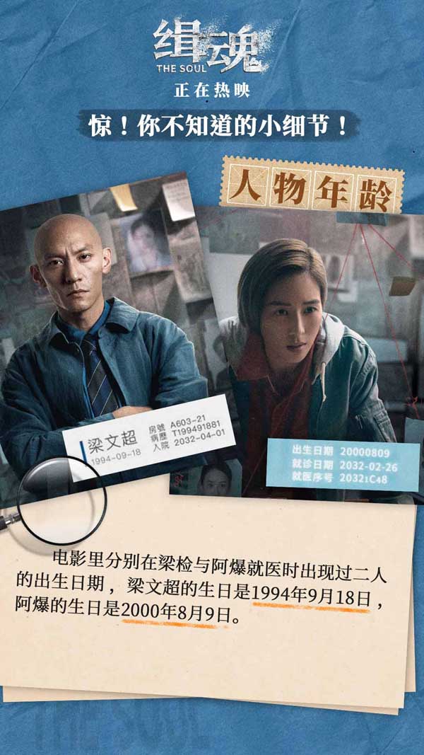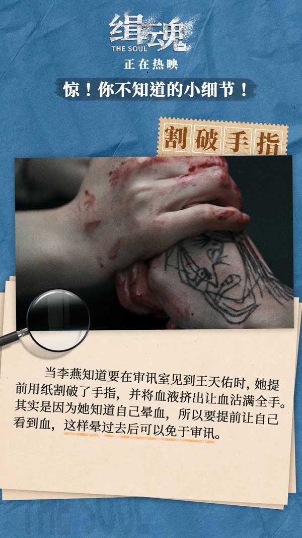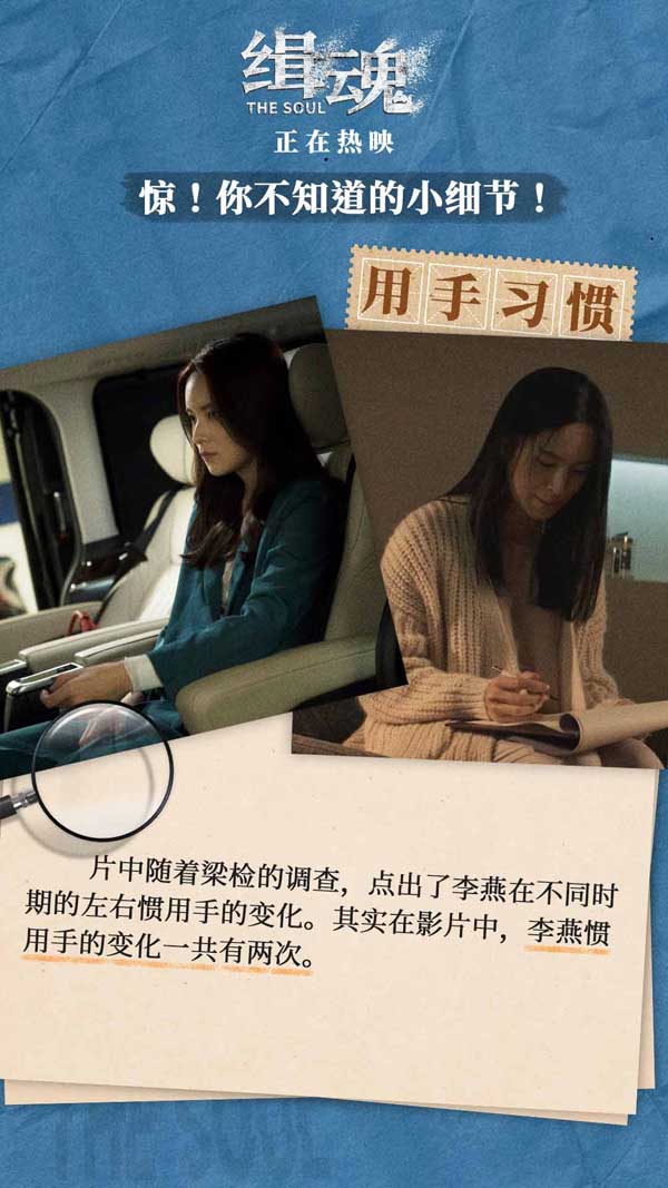 《缉魂》改编自江波获奖科幻小说《移魂有术》,在以东方视角讨论“灵魂”观点的基础上,导演程伟豪还独具匠心地在影片中加入许多巧妙细节,让影片更具深度和广度。片中梁检走路时“一瘸一拐”的姿态,证明癌细胞已经扩散至影响他行走的程度,为后期角色病情恶化做好铺垫;李燕在不同时期发生的口音转换以及左右惯用手的变化,均意味剧情的转折;此外李燕审讯前用纸割破手指,实际上是利用自己的晕血症躲过审讯,塑造出角色心机深重的形象。