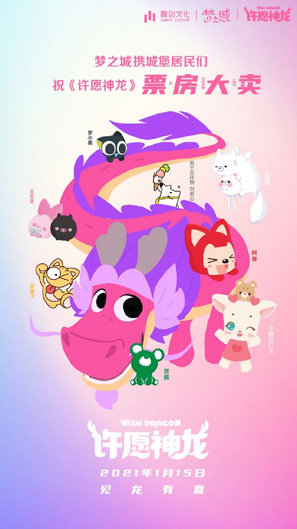 阿狸、罗小黑、小鹿杏仁儿、刘看山、皮揣子等等来自梦之城的城堡居民们,也一起来为神龙应援,大小萌神梦幻联动,喜气加倍,可谓是萌到心坎里!神龙还与“同道大叔”旗下的十二星座卡通形象合作,神龙自带的好运寓意结合星座运势,让不同的受众群体都能领略神龙的魅力。影片上映后,“同道大叔观影团”也举办了线下观影,让更多希望获得好运的小伙伴,收到了来自神龙的祝福。此外,还有《许愿神龙》还与屁桃君一同推出联动海报,可爱屁桃君与俏皮神龙合影,又萌又好笑。粉萌神龙还受邀参加樱花少女的网络直播,一起同框出镜,粉萌加倍!