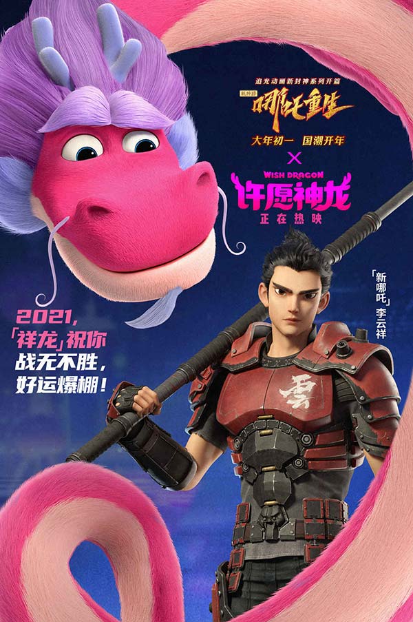 在与《灵笼》的联动海报中,神龙正载着冉冰翱翔天际,远处是驾驶飞行器的丁思齐和浮空城市“灯塔”,两部作品中的主要人物产生了奇妙的互动,你中有我、我中有你;在与《西行纪》的联动海报中,天羽织微微颔首,神龙呈心形环绕在她周围,看起来似乎正在向神龙许愿。在《许愿神龙》与将于大年初一上映的动画电影《新神榜:哪吒重生》一同发布的联动海报中,“新神龙”与“新哪吒”李云祥同框出镜,被网友戏称是“祥龙CP”,粉萌与酷帅搭配,竟然出乎意料的和谐!两部影片都对传统文化进行了创新和延展,使经典角色焕发新的生机,也为中国动画补充了新的力量,意义十分深远!