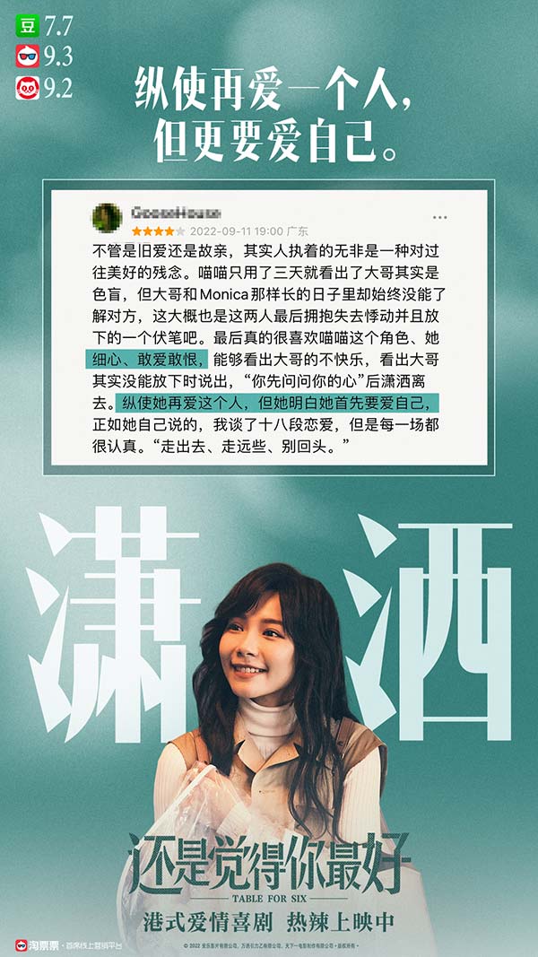 电影品质不仅受到央媒的肯定,在微博、抖音、小红书等社交平台也收获众多观众好评。有网友自发玩起片名梗,约喜欢的人看《还是觉得你最好》成为今秋表白的新方式;影片中的爱情故事热辣劲爆,所探讨的情感问题真实戳心,引发不少观众分享自己的情感经历,与角色产生共鸣;各种粤语笑料信手拈来层出不穷,对亲情爱情的诠释真挚动人,得到观众“契合中秋观影的欢乐团圆氛围,不落俗套好笑解压,中秋最值得一看”的夸赞。