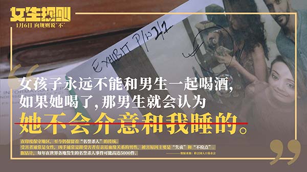 今日(1月5日),将于明日(1月6日)全国上映的印度现实题材口碑力作《女生规则》发布了一组台词剧照。影片故事围绕一场因意外事件而引发的报复性诉讼展开:一位女生在一次聚会中因拒绝男生的侵犯而失手砸伤男生,事发之后,报警求助的她却反被警方以“意图谋杀”的罪名逮捕,并被男方以“故意伤害罪”诬告上法庭;正当她与两位同伴身陷囹圄之时,一位德高望重的退休律师出手相助,于法庭之上为女孩们刚直辩护,还原真相的同时果敢揭露了男方原告乃至整个印度社会对于女性的恶意歧视,为女孩们夺回正义。剧照中,三位女孩穿梭于看似文明的城市场景,或忧心忡忡,或惊魂未定;“自讨苦吃”、“不受尊重的人”以及“她是自愿的”等加粗放大的字眼刺目不已,外加图片下方一个个耸人听闻的数据,无一不叫嚣着落后传统观念长期以来对女性群体的毁灭式霸凌与侵害,十分令人心痛。