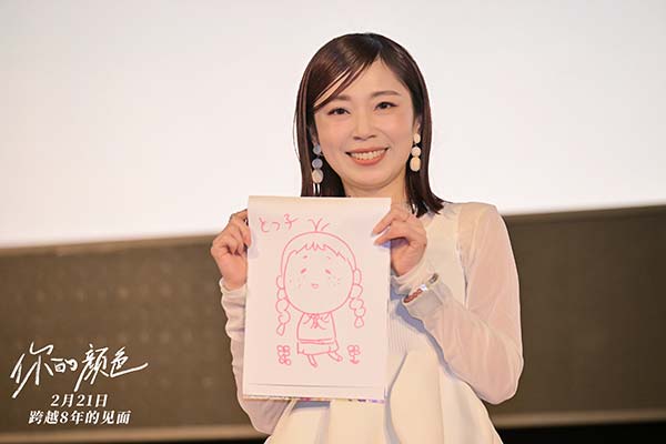 映后交流现场同样也有不少“双向奔赴”的惊喜,有观众将自己打扮成山田尚子导演作品中的角色,并以角色的口吻向导演传递自己的热爱。山田尚子被观众的热情打动,开玩笑地表示:“完全没想到会和自己创造的角色在中国相遇,已经顾不上你的提问了,只想尽快拥抱自己笔下的角色。”随后更是邀请观众与自己“花式比心”合影,定格下自己与笔下角色重逢的瞬间。此外,不少观众也为导演送上自己的祝福,代表中国特色的熊猫发箍、肉夹馍玩偶;亲手制作的手链、香水;带着青春气息的花束等礼物为山田山子导演和电影《你的颜色》送上祝福与支持,为初春增添一抹温馨的色彩。