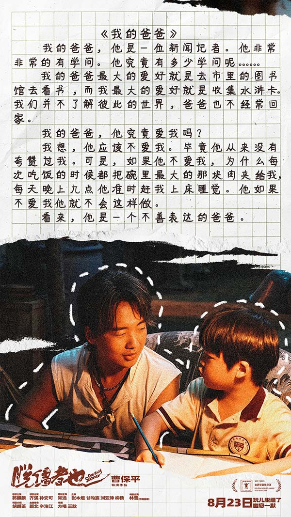 电影《脱缰者也》此次发布的预告以马飞(郭麒麟 饰)教外甥李嘉文(胡朗荃 饰)写题为《我的爸爸》的作文为切入点。起初马飞还在描述着李嘉文的爸爸,说着说着却不自觉地代入了自己的父亲。在他眼里,父子二人如同生活在两个世界,彼此缺乏了解,也从未表达过爱意。他清楚自己和父亲始终存在着隔阂,也道出了一直藏在心中的困惑:“我的爸爸究竟爱我吗?”而随着马飞讲述的推进,马家其他成员——马飞的二姐(齐溪 饰)、二姐夫(常远 饰)、大姐夫(刘亚津 饰)和大姐(柳杨 饰)对父子之间纠葛的复杂态度逐渐展现。二姐拿出的“亲子关系断绝书”,更是揭开了马飞与父亲之间无法调和的矛盾,也留下了诸多悬念:马家究竟发生了什么?马飞为何会被亲人送进少管所?“老舅绑外甥”的事故又将如何收场?