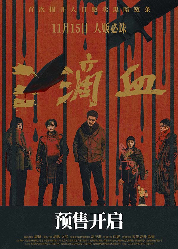 由导演康博编剧执导,胡歌、文淇、高子淇领衔主演,闫妮特别主演、宋佳、高叶、欧豪特别出演的国内首部揭秘人贩作案产业链内幕的犯罪电影《三滴血》将于11月15日全国公映。今日,影片发布“罪大恶极”角色特辑及预售海报,众主演首度剖析角色内心,利刃高悬于顶,红色底色如血漫开,共同解读这个在冰雪罪案中追寻人性微光的救赎故事。影片于今日全面开启预售,一场直击人口贩卖恶行、拷问人性深度的救赎之旅,静待您的见证。