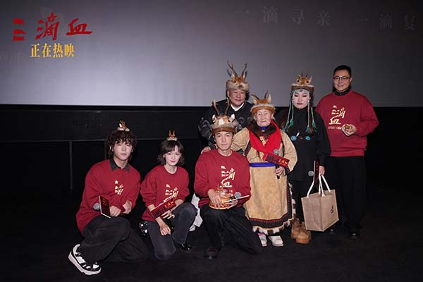 首映礼上,《三滴血》插曲《摇篮曲》演唱者、鄂伦春族非遗传承人小花鹿奶奶,特意从远方赶来,为影片送上祝福。更令人感动的是,她将亲手制作了三个月的非遗桦树皮盒子赠予主创,并用古老的“赞达仁”调子唱响《摇篮曲》。“就像驯鹿迁徙,无论走多远,都会记得回家的路。”这句来自森林的古老祝福,与电影中血脉相连的主题交相辉映,让现场弥漫着温暖感人的氛围。