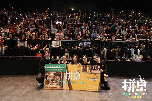 由上影集团领衔出品,张律监制,陈洁担任制片人,吴靖担任编剧并执导,王传君、江疏影领衔主演,李雪琴、郑云龙、傅首尔、刘佳主演,王彩平、杜家毅特邀出演,吴冕、白举纲、田野(老四)特别出演,田小洁、罗海琼、齐溪、许龄月、葵葵友情出演的电影《拼桌》,于3月12日在上海举行“好好吃,好好爱”主题首映礼及路演活动。编剧兼导演吴靖携领衔主演王传君、江疏影,主演李雪琴、郑云龙等主创悉数亮相。映后互动环节,主创团队熟人局欢乐满满,与观众热情交流,全员诚挚分享创作心路,详解美食与爱的链接。电影将生活的美好落点于一餐一饭中,向观众传达“爱人先爱己”的内核,收获了观众与嘉宾们的一致好评,现场观众情绪高涨,高能整活掌声不断。电影将于3月14日白色情人节全国上映,当前火热预售中,敬请期待!